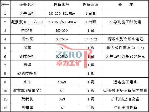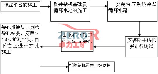 作業(yè)平臺的施工 反井鉆機(jī)基礎(chǔ)及循環(huán)水池的施工 安裝液壓系統(tǒng)冷卻循環(huán)水箱 安裝反井鉆機(jī)并進(jìn)行調(diào)試 由上往下鉆進(jìn)Φ216mm導(dǎo)孔 導(dǎo)孔貫通后,拆除導(dǎo)孔鉆頭,安裝Φ1.4m擴(kuò)孔鉆頭,由下往上進(jìn)行擴(kuò)孔施工 拆除鉆機(jī)及井口好防護(hù)