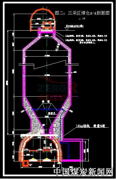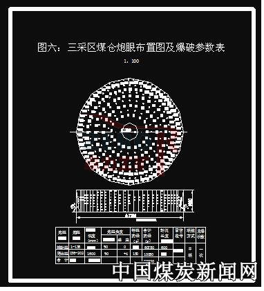 2、支護形式。(1)煤倉擴刷期間:煤倉采用錨網(wǎng)噴作為臨時支護,錨桿采用Φ20mm,長2.0m的螺紋金屬錨桿,錨桿間排距為750mm×800mm;金屬網(wǎng)規(guī)格為1560mm×900mm,噴厚為100mm。(2)煤倉擴刷到位后:煤倉上口和倉身選用Φ20mm的螺紋鋼筋+混凝土澆灌,澆灌厚度為500mm。煤倉下口澆灌選用18kg鋼軌+Φ20mm的螺紋鋼筋聯(lián)合澆灌,煤倉下口澆灌厚度為1.0m。